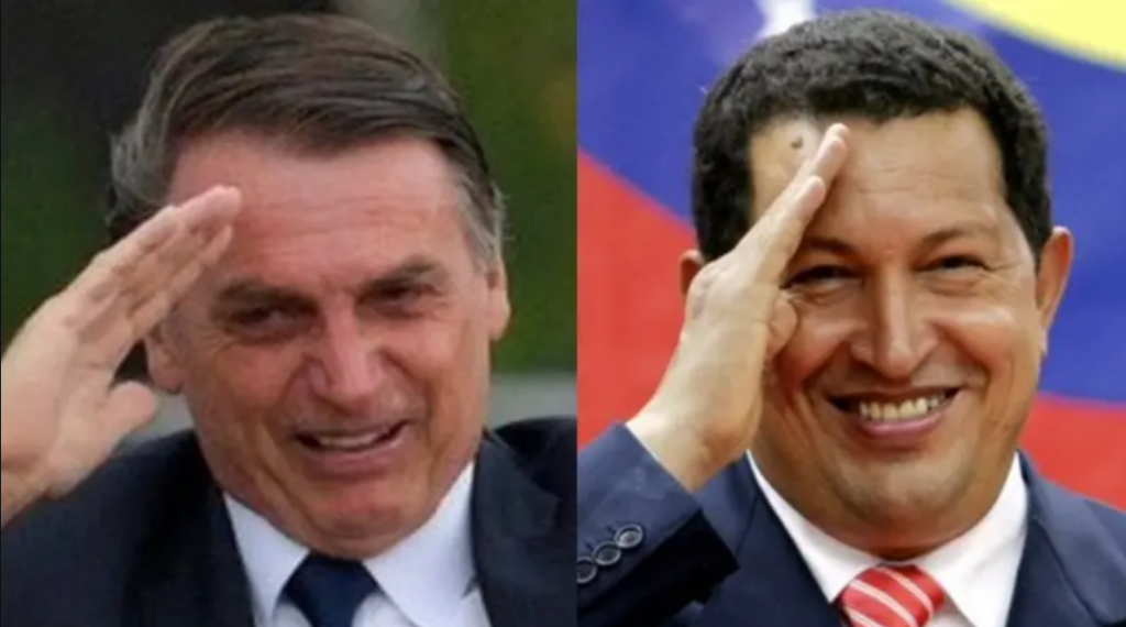 No entanto, o próprio Bolsonaro, em diversas ocasiões, expressou admiração por Hugo Chávez, reconhecendo o viés militarista do ex-presidente venezuelano. Em 1999, ano em que Chávez assumiu o poder num golpe militar, Bolsonaro afirmou que ele era “esperança para América Latina” e que gostaria que sua “filosofia chegasse ao Brasil”. Além disso, em 2006, Chávez defendeu armar um milhão de venezuelanos para consolidar seu poder — uma retórica assustadoramente similar à de Bolsonaro na infame reunião ministerial de abril de 2020, onde sugeriu armar a população brasileira. Detalhe importante, as proximidades não ficaram no campo da retórica, o governo venezuelano é militarizado, assim como foi o gabinete ministerial de Bolsonaro, que com o passar do tempo foi ficando cada vez mais parecido com uma reunião do alto comando das Forças Armadas, assumindo do ministério da saúde à, ironicamente, Casa Civil.