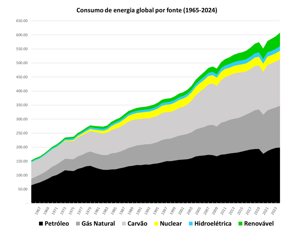As adições sucessivas são visualmente claras: independentemente do aumento do consumo proveniente de fontes renováveis e “limpas”, não houve redução nem no consumo total de energia nem no consumo fóssil. Apesar das diferentes taxas de crescimento, a tendência geral é de expansão constante em todas as fontes. As renováveis estão sendo adicionadas ao uso existente de combustíveis fósseis, não os substituindo.
